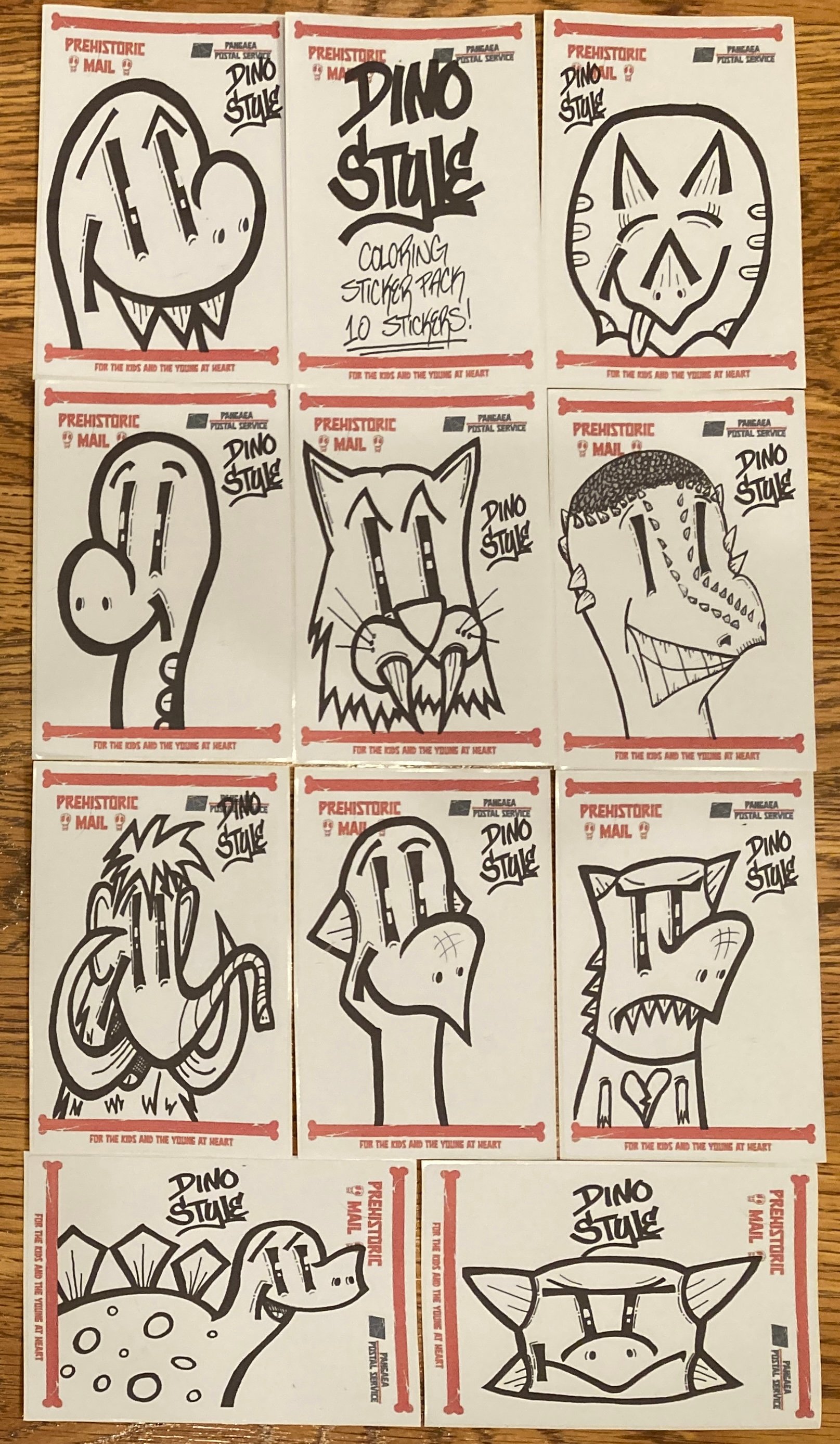10 stickers for you to color! Printed on 4” x 6” custom Prehistoric Mail Labels. Each pack contains the ten characters shown in the image: “The Dino”, Triceratops, Brontosaurus, Saber-Tooth Cat, Pachycephalosaurus, Wooly Mammoth, Psittacosaurus, Carnotaurus, Stegosaurus, and Ankylosaurus.